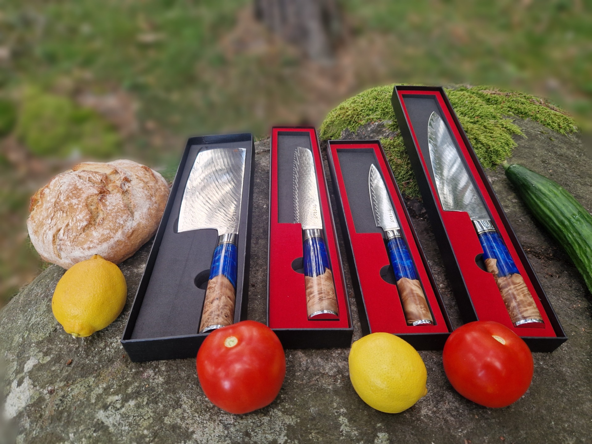 Dessa fyra damaskusknivar är smidda i 67 lager stål med japansk VG10-kärna – ett material känt för sin extrema skärpa, hållbarhet och vackra mönstring. Handtagen är gjorda i resin och stabiliserat trä, vilket ger varje kniv ett unikt utseende och en perfekt balans i handen.