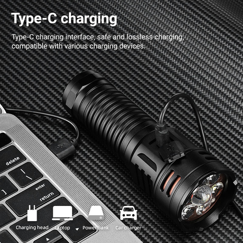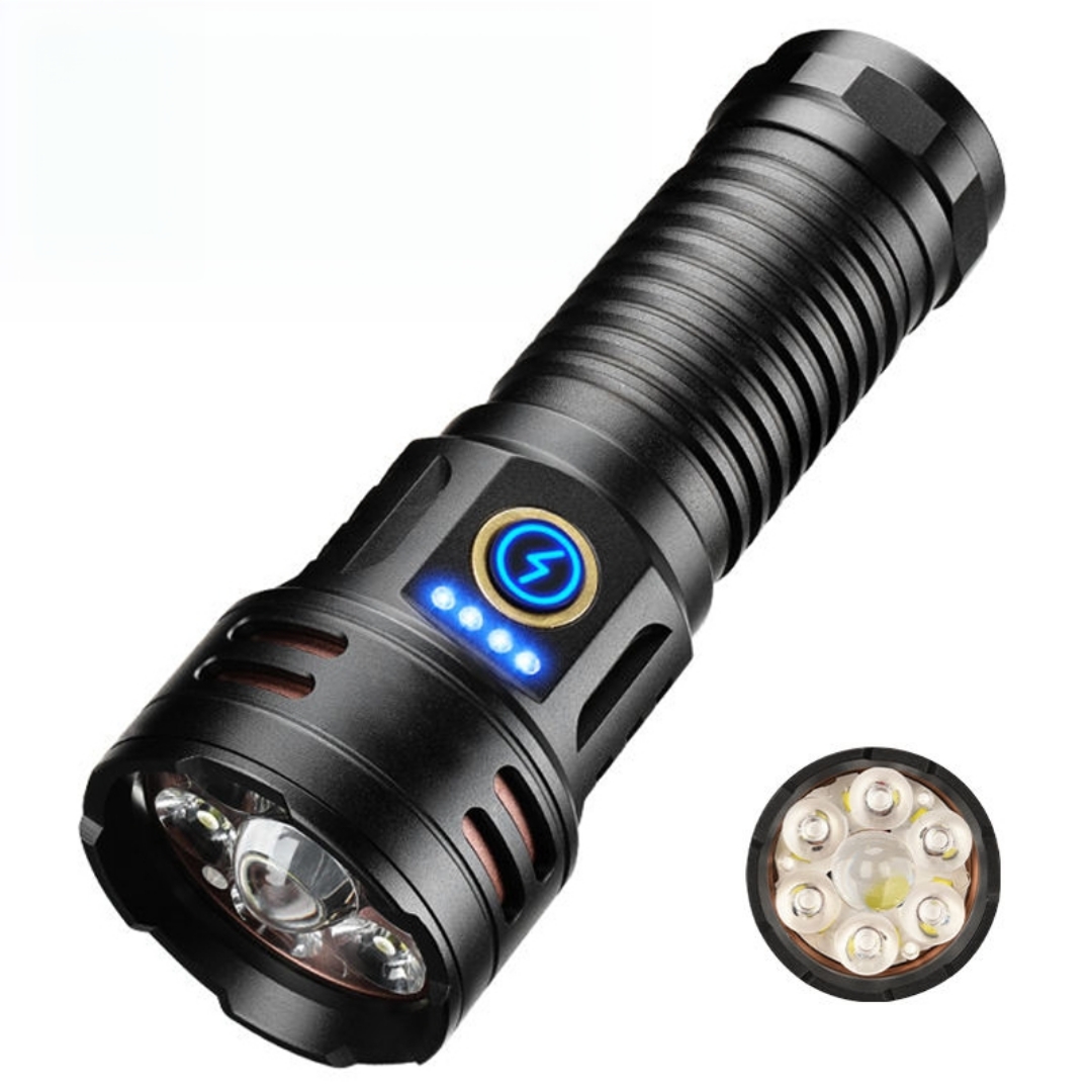 En kraftfull men kompakt ficklampa på 40 W som kombinerar laserfokuserad LED med 6 st P35 floodlight-LED. Resultatet blir ett otroligt starkt och brett vitt ljus som når ca 500 meter och samtidigt lyser upp omfattande ytor. Perfekt för dig som vill ha en liten ficklampa med maximal prestanda – oavsett om det gäller jakt, fiske, camping, arbete eller nödsituationer.