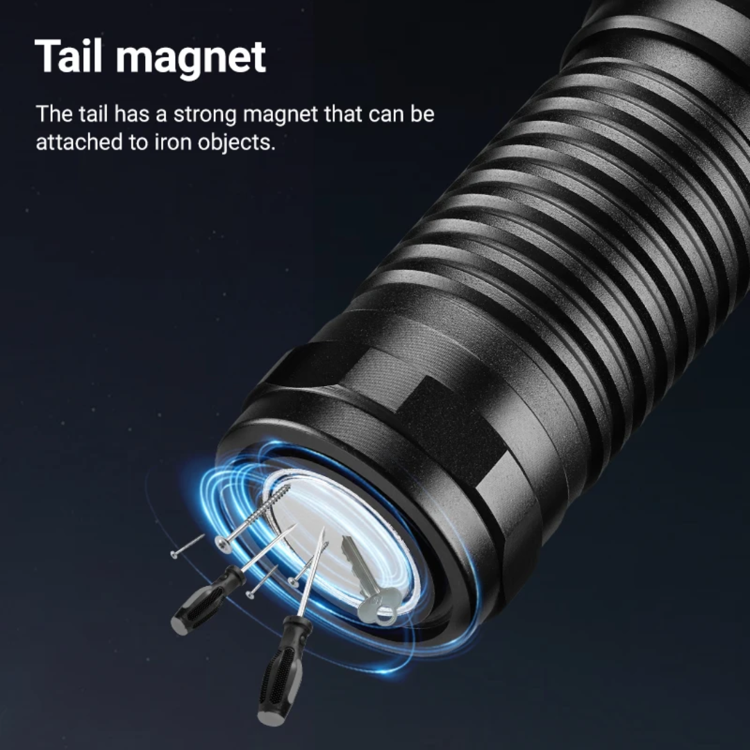 • Stark magnet i bakänden: Fäst ficklampan på metalliska ytor – perfekt vid arbete, camping eller nödsituationer.