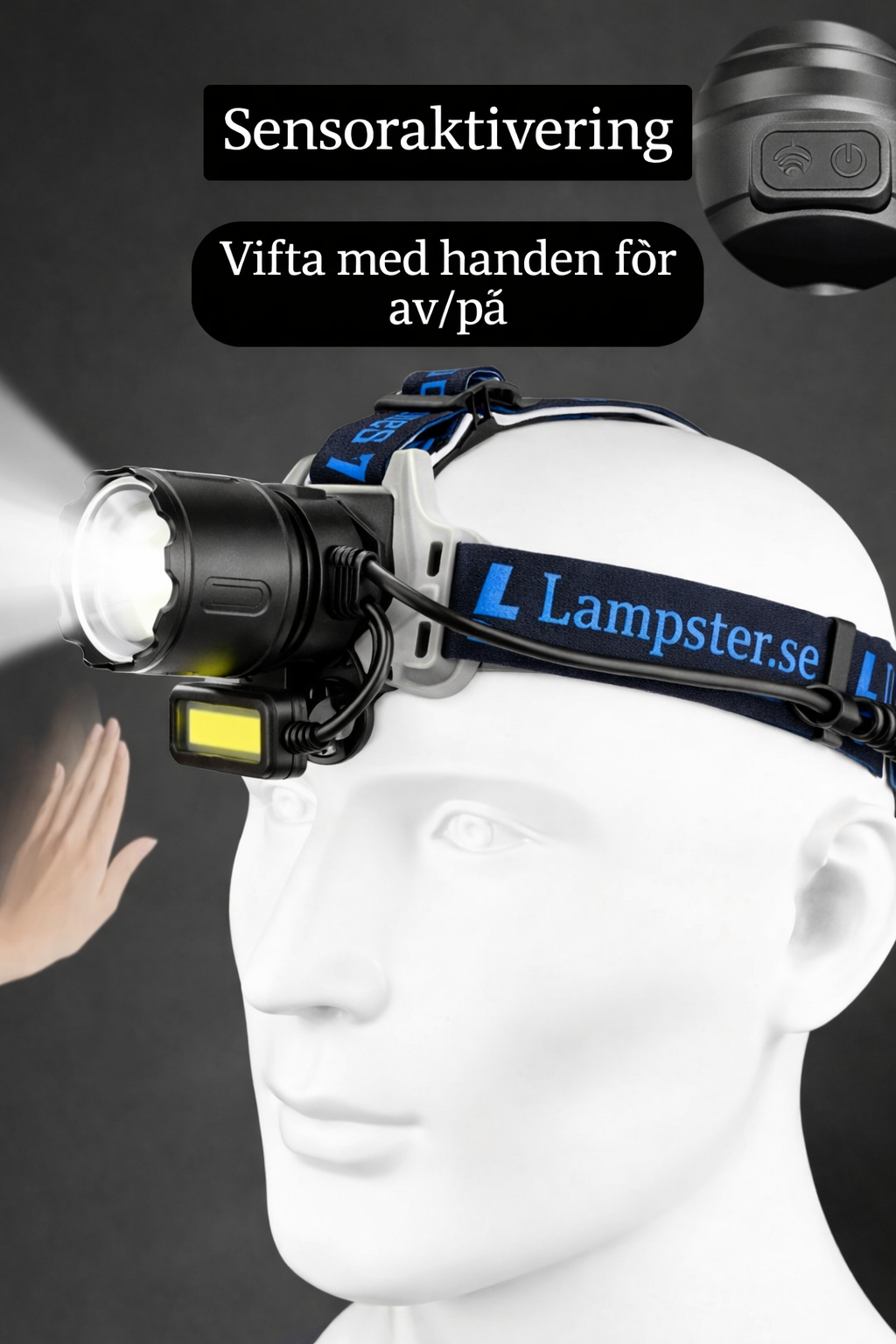 Intelligent pannlampa med rörelsesensor - vifta med handen inom 20 cm från enheten för på/av. Sensorn kan avaktiveras, och lampan slås då på eller av med knapp istället. Försedd med röd och blå varningslampa på baksidan som kan sättas på/av samt blinka. Avtagbart batteripack (når ca 50 cm).