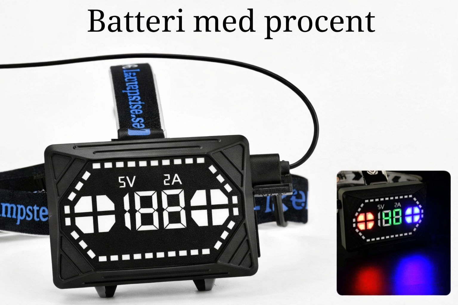 På pannlampans batteripack visas aktuell batteriprocent digitalt. Två USB-in portar (USB-C och micro-USB) för att ladda lampan samt USB-ut port för att använda lampans ström. Perfekt som powerbank för att ladda telefonen vid exempelvis nödfall, med en total batterikapacitet på hela 9000 mAh.
